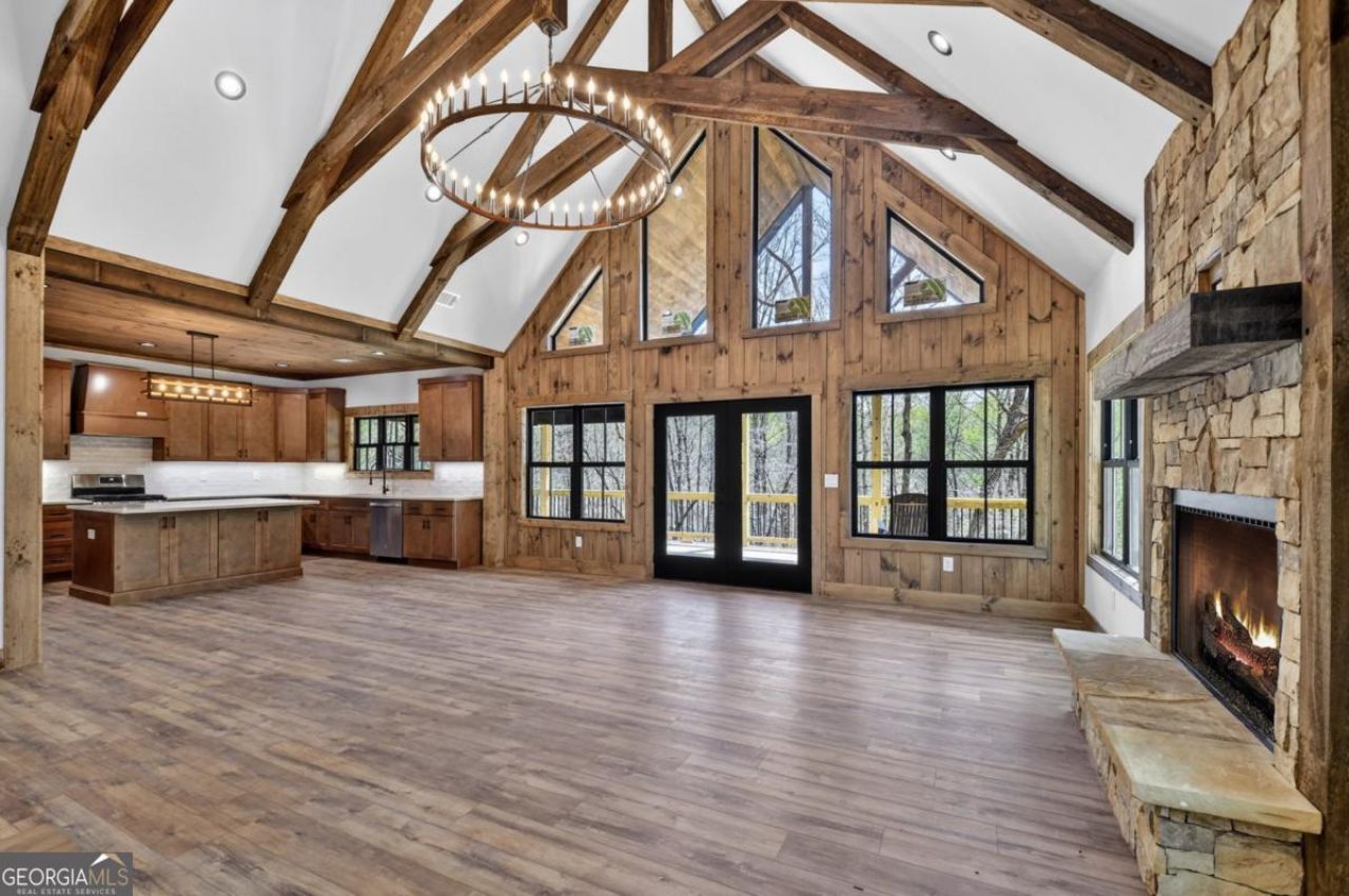CREEK FRONT + TOCCOA RIVER ACCESS... Just 6 minutes from downtown Blue Ridge and Old Toccoa Farm, this stunning 3,100sqft, new construction offers the perfect balance of privacy and convenience. Set on 4 private acres in a gated community, a peaceful creek winds through the property, with exclusive access to the Toccoa River for fishing and kayaking. Designed with modern rustic style, the home features striking gables, exposed beams, and a seamless blend of wood and drywall. The open main level includes a spacious great room with a stone fireplace, a chef's kitchen with quartz countertops and walk-in pantry, a full-size laundry room with cabinetry, and a convenient half bath for guests. The primary suite offers vaulted ceilings with exposed beams, a large walk-in closet, a spa-like bath with both stand alone bath + walk-in glass shower, and a versatile bonus area ideal for a sitting room or home office. The terrace level adds a second living area with a striking wood fireplace, wet bar and two oversized guest suites-each featuring private en-suite baths and walk-in closets. Outdoor living shines with upper and lower porches overlooking the creek-perfect for relaxing or entertaining. You can also enjoy the fantastic, newly and professionally installed landscaping. Ideal as a full-time home, luxury getaway, or income-producing rental, this property captures the best of North Georgia mountain living.