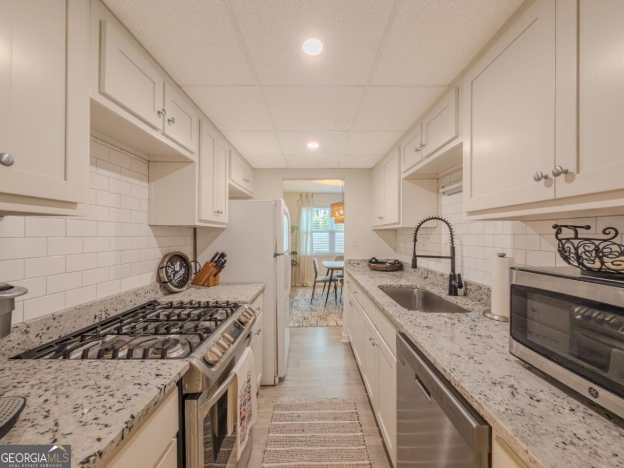 Fresh, stylish, and truly move-in ready, this beautifully updated Athens townhome delivers the kind of turnkey living buyers are looking for-just a convenient walk to campus area attractions, including an approximately 2-mile walk to Sanford Stadium. Inside, you'll love the modern, cohesive finishes throughout: gray laminate flooring, fresh paint, and updated lighting that creates a bright, welcoming feel from room to room. The renovated kitchen features white cabinetry, stainless steel appliances, subway tile backsplash, and upgraded countertops-clean, classic, and designed for everyday function. The dining area is a standout with designer wallpaper and a statement chandelier, offering a polished space for meals, entertaining, or work-from-home flexibility. Relax in the comfortable living area with a fireplace and easy access to the outdoor space for enjoying fresh air and downtime. Major improvements include a newer roof, new windows throughout, a tankless water heater, a new front door, and a new awning-adding both peace of mind and curb appeal. With no rental restrictions, this property also offers flexibility for personal use or investment. Conveniently located near shopping, dining, and everyday Athens amenities.